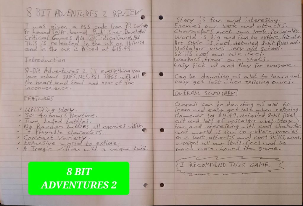 Overall can be daunting as alot to learn and can be easy to get lost when exploring. However for £15.49, is a detailed 8 bit pixel art style and has lots of nostalgic vibes and the story is interesting and fun with cool characters and the world is fun to explore with enemies having own look and own attacks to them that you have to learn in order to beat them and skills armor weapons are cool as alot of variety to them and all have own stats and own feel to them and much more. I LOVED THIS GAME