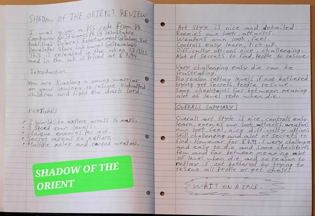 Overall the art style is nice and the controls are easy to learn with the enemies all have own look and attacks to learn in order to beat them and weapons are cool as alot of variety to them and all have own feel to them and own look and nice difficulty options and still challenging even on easy and alot of secrets to find. However, for £7.99. Is very challenging and easy to die in a couple of hits and some checkpoints are far between meaning when you die might have alot of level to replay and if you are not bothered by trying to get treasure chests or try to rescue the kidnapped children then no real reason replay the levels again.